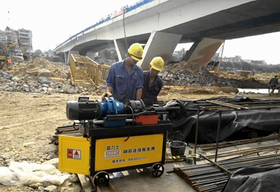正在開(kāi)工中的桂林漓江橋擴建工程工地現場(chǎng),鉆機、吊機、裝載機 紛紛開(kāi)動(dòng),固力士套筒及設備也有序進(jìn)入了工地現場(chǎng),漓江橋擴建工程是桂林市2015年度“重中之重”項目,工期緊、任務(wù)重。為了聯(lián)合大橋局加緊工程項目,深圳市固力士建材有限公司工程部牟經(jīng)理連夜趕到工程現場(chǎng)進(jìn)行技術(shù)指導,克服困難,加班加點(diǎn),為工程保質(zhì)保量順利施工提供一切有利的技術(shù)支持。目前,桂林漓江橋擴建工程鋼筋連接設備已全部正常運行。